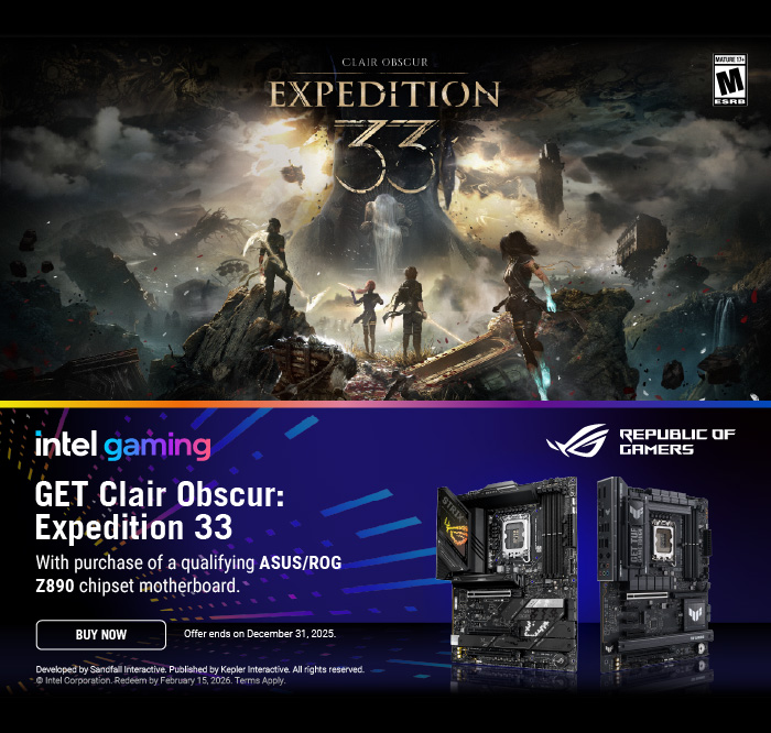 Get more with your next PC build or motherboard upgrade with qualifying ASUS/ROG Z890 chipset motherboards! Register your motherboard purchase for a free copy of Clair Obscur: Expedition 33 courtesy of Intel Gaming. Terms apply & offer ends December 31, 2025 - learn more at the link below.