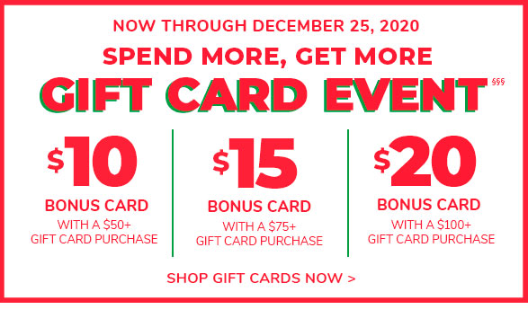 §§§Valid on a single transaction of an online gift card purchase of $50+, $75+ or $100+. Respectively, customer will receive a $10, $15 or $20 bonus card for use on a future purchase, and subject to terms & conditions.